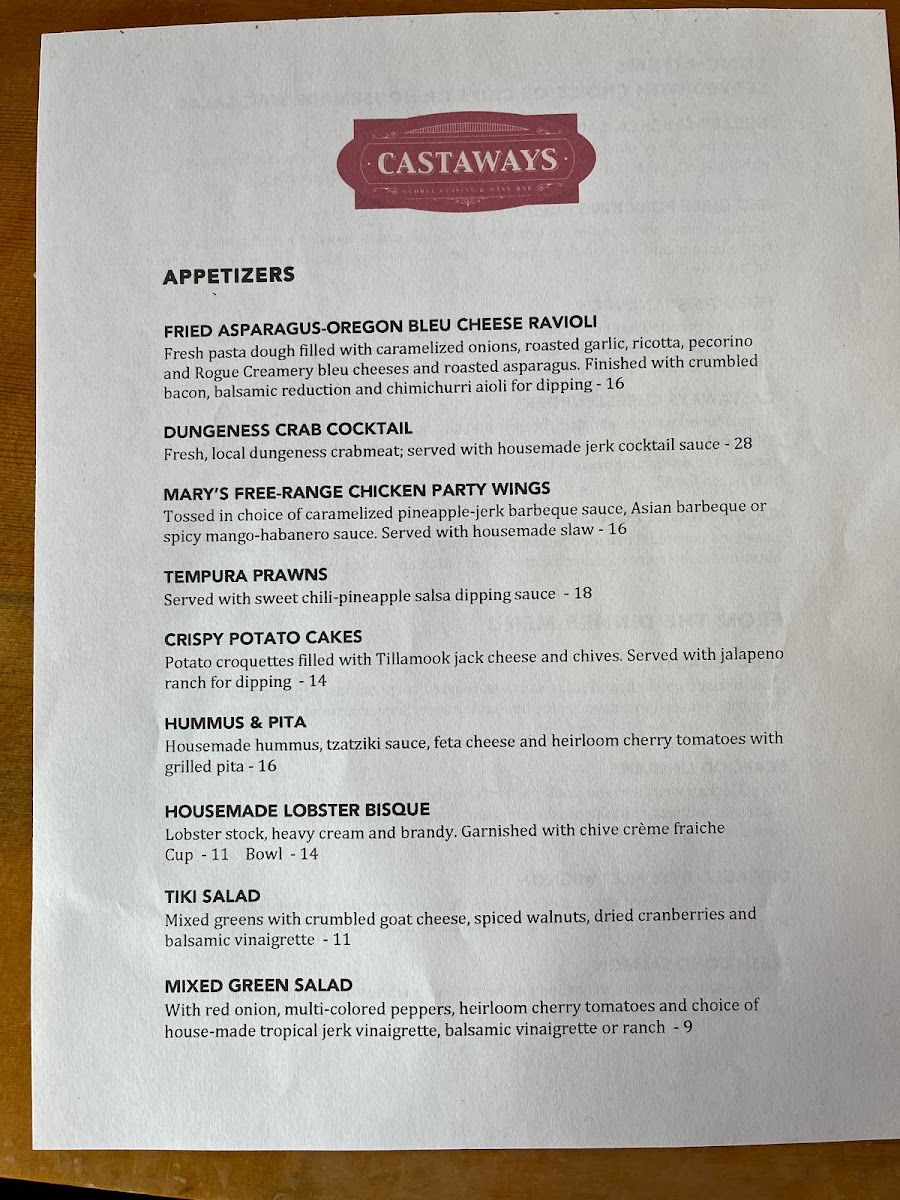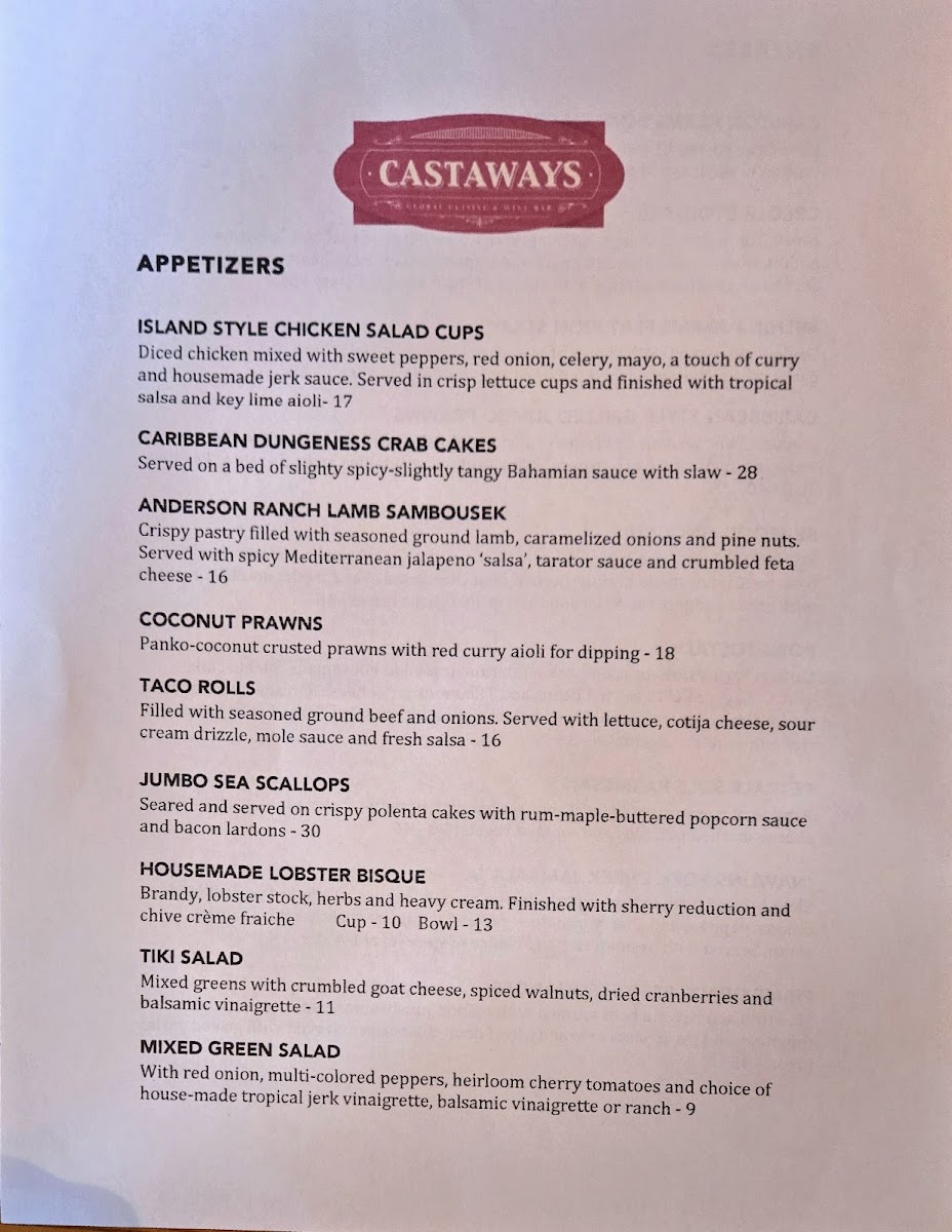 For those looking to warm up with a hearty dish, Castaways' Soups & Salads section is a must-try. The House-Made Seafood Chowder is a creamy, rich option that brings the taste of the coast to your table, while the Tiki Salad and Mixed Green Salad offer lighter, refreshing choices for a perfect balance.