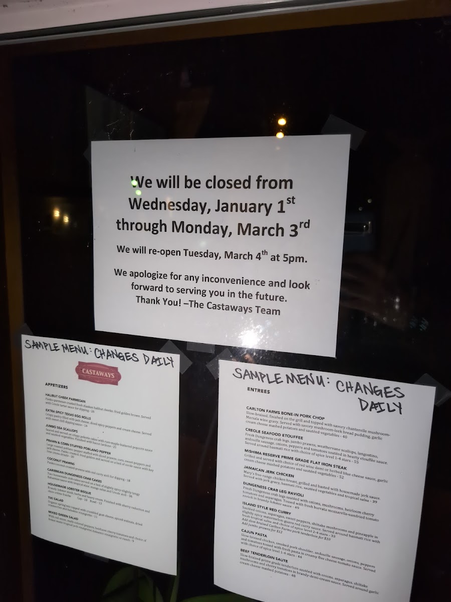 Moving on to the Entrees, Castaways Global Cuisine really showcases its culinary talent. The Carlton Farms Bone-In Pork Chop is a standout, offering a tender and juicy experience. For those craving bold flavors, the Creole Etouffee is a flavorful choice that takes you straight to Louisiana, while the Dry Aged 8 Oz. Filet Mignon promises a melt-in-your-mouth steak experience. If you're in the mood for something a little different, the Daily Ravioli Special is always changing, offering unique pasta creations, while the Nawlins Style Jambalaya brings a touch of spice and soul.