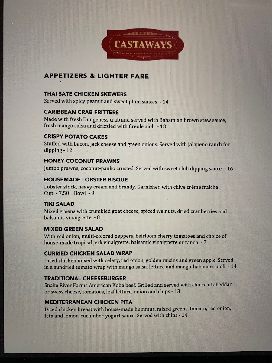 The Appetizers & Lighter Fare section features repeat favorites like the Thai Sate Chicken Skewers, Caribbean Crab Fritters, and Honey Coconut Prawns, along with the Housemade Lobster Bisque, a rich and indulgent option for seafood lovers, and Crispy Potato Cakes, which add a comforting and crispy element to your meal.